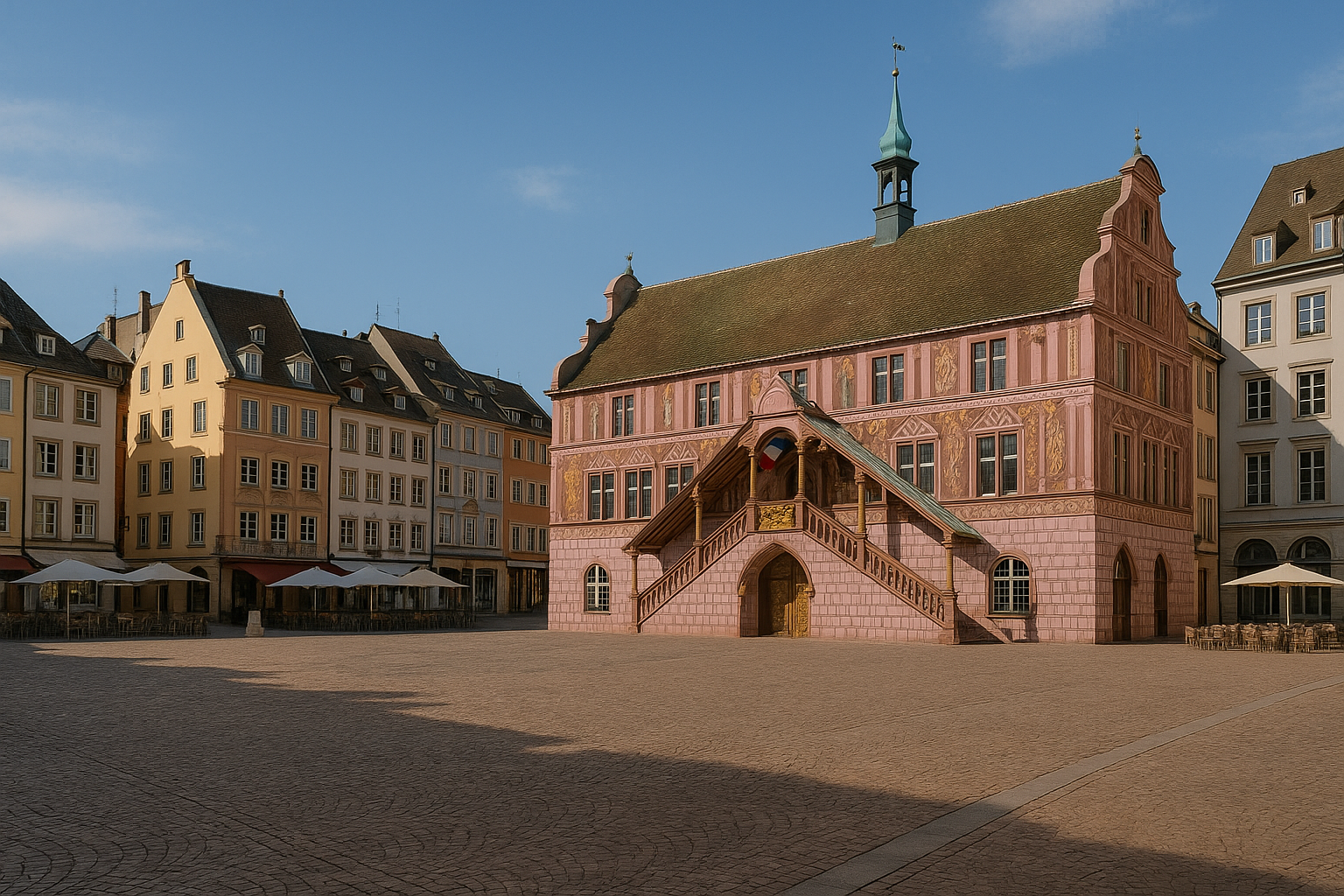 Le cœur historique de Mulhouse se concentre autour de la Place de la Réunion, véritable joyau architectural. L'Hôtel de Ville, avec sa façade rose ornée de trompe-l'œil, attire immédiatement l'attention. Construit en 1552 dans un style Renaissance rhénane, il abrite des fresques remarquables que vous pourrez admirer lors d'une visite guidée.