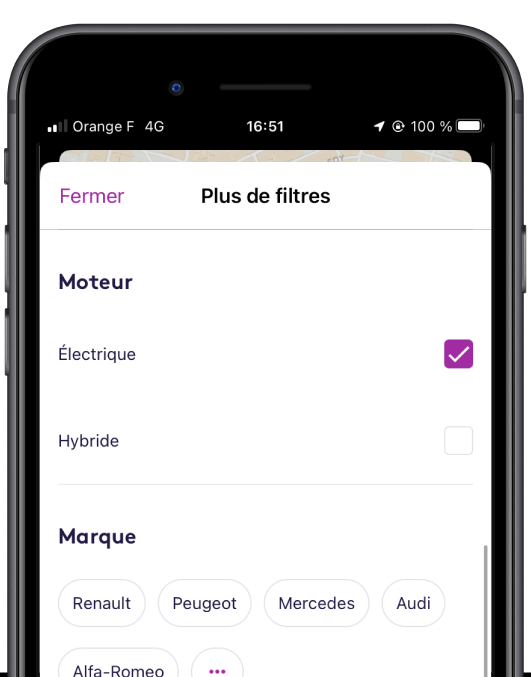 Que vous ayez un rendez-vous professionnel, un weekend en famille ou toute autre destination à rejoindre absolument, trouver la voiture électrique idéale en un instant grâce au filtre “Moteur”.
