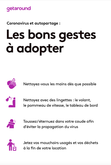 - Mettez à disposition du gel hydroalcoolique ainsi que des lingettes nettoyantes dans votre véhicule afin d’en suggérer l’usage par vos locataires.