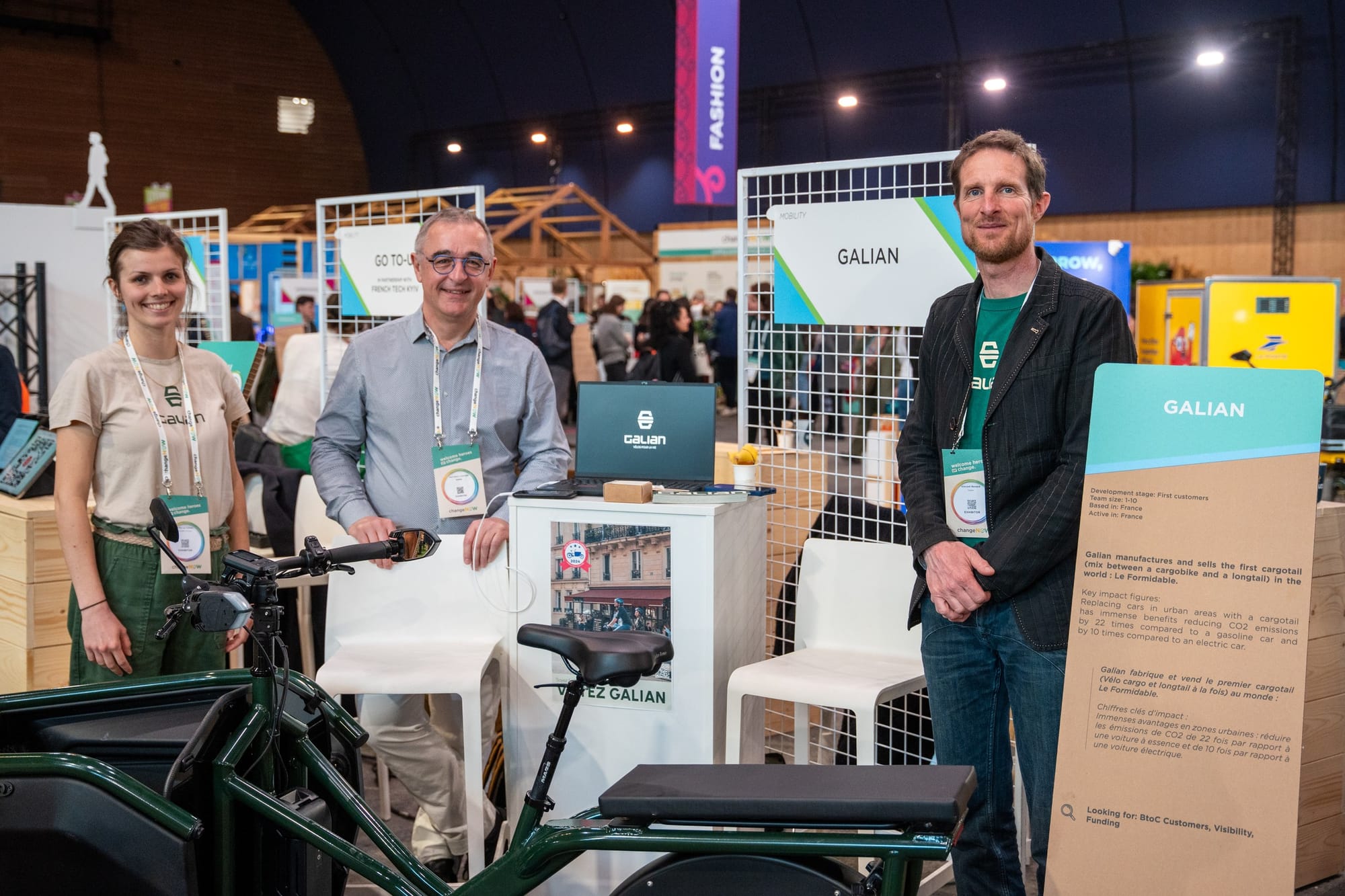 Le producteur français de vélos longtail et de transport de marchandises était l'un de nos co-exposants dans la section mobilité de ChangeNOW. Galian fabrique des vélos assez grands pour transporter toute une famille et un plein de courses . L' objectif ? Proposer une alternative à un trajet en voiture pour les citadins pour leurs petits déplacements en ville. L'ambition de leur mission est démontrée par l'emplacement de leur siège, à l'intérieur de l'usine de fabrication automobile Janais, au sud de Rennes. Deux des quatre fondateurs étaient ingénieurs chez Citroën.