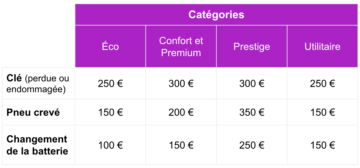 À partir du 17 février, nous ajustons le montant de 3 types de dommage (clé perdue ou endommagée, pneu crevé, batterie) afin de mieux refléter la réalité des cas rencontrés sur la plateforme et des standards du secteur (voir ci-dessous).