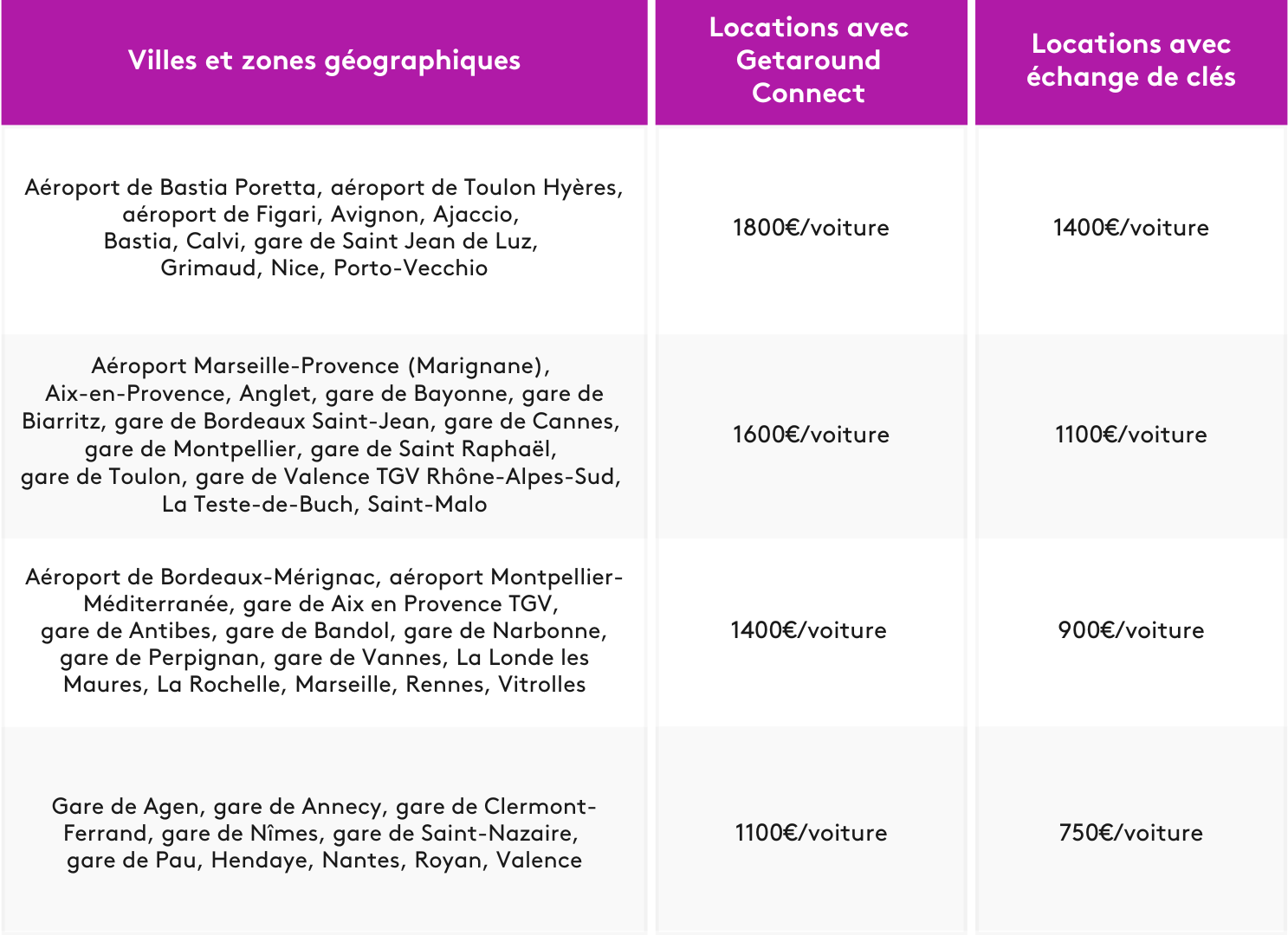 Ces montants dépendent de la ville ainsi que du mode de location : Getaround Connect ou par échange de clés.