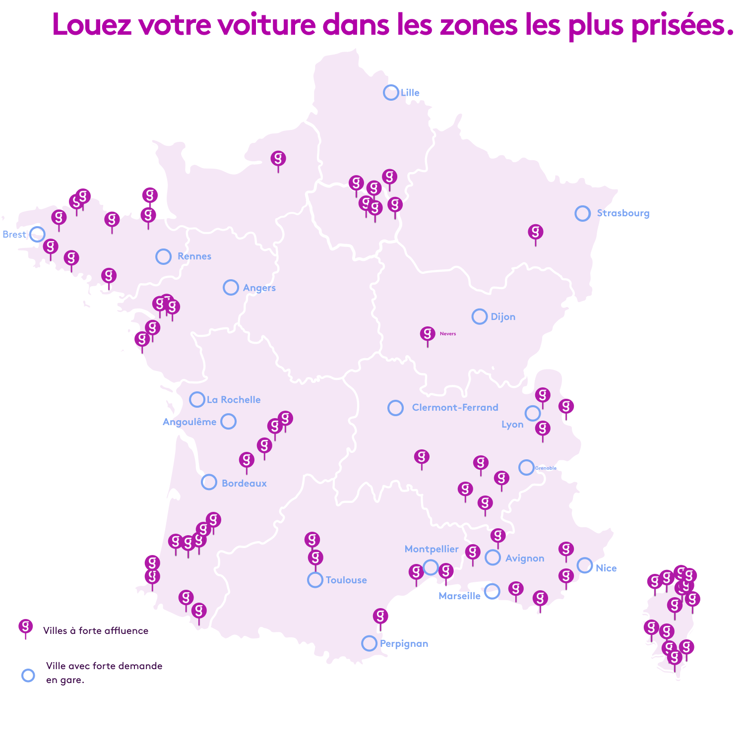 La saison estivale est synonyme de forte affluence et certaines villes de France bénéficient d’importante vagues de demande de locations. Afin de recevoir toujours plus de demande, placez votre voiture dans les zones les plus prisées ! N’oubliez pas que les gares et les aéroports sont des lieux transit importants pour les voyageurs de tous horizons.
