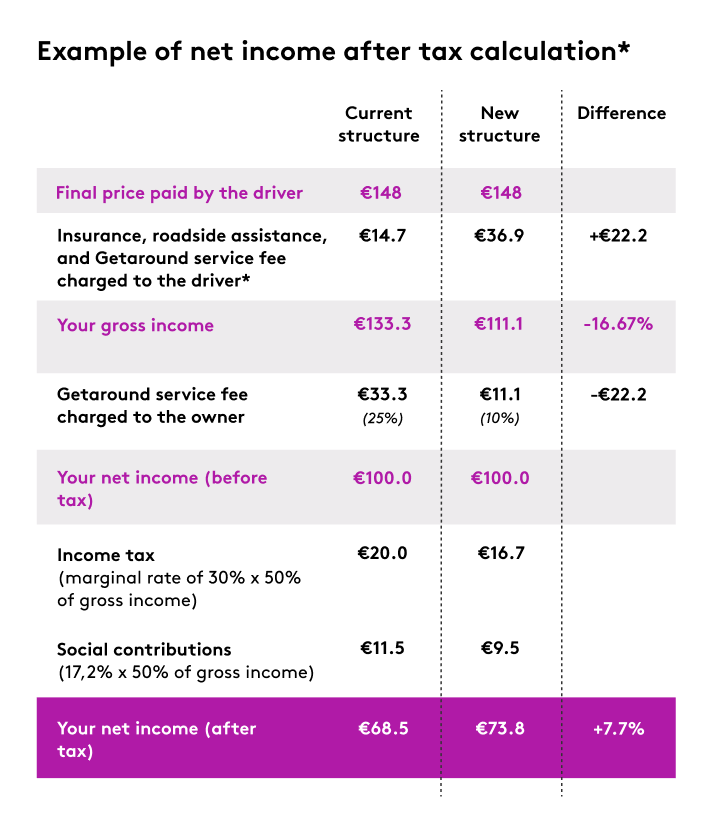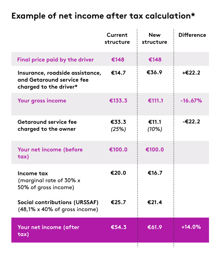 *Illustration for an owner subject to the Micro-BIC regime with a marginal tax rate of 30%, a rental income > 8227€ and a 25% service fee rate charged by Getaround. The rental price and the cost of insurance, roadside assistance, and Getaround’s service fee charged to the driver depend on the rental criteria. Typical illustration of a three-day, pre-booked non-Connect rental for a category 1 vehicle in the French province.